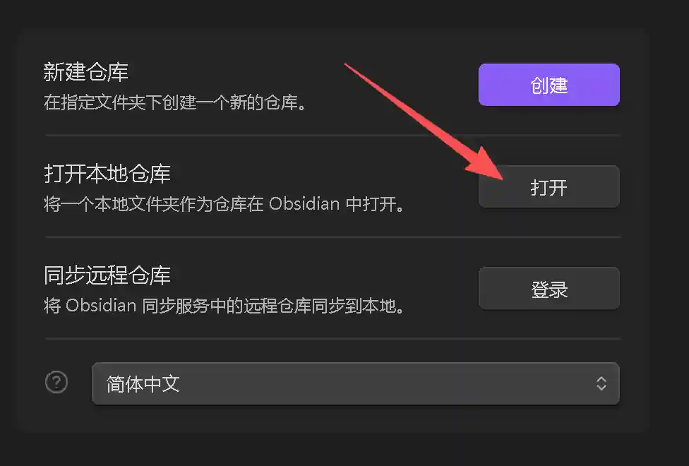 在 https://obsidian.md/download 下载并安装,完成后打开obsidian选择my-blog作为本地仓库打开: