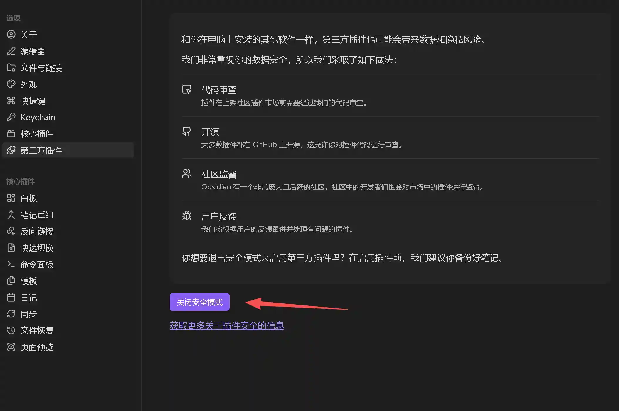 在设置的第三方插件处,关闭安全模式